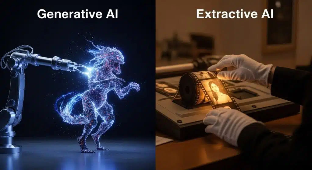 Extractive AI is a technology that analyzes existing content (like your stream VOD) and “extracts” the most important or relevant parts. Think of it as an intelligent curator that finds the best moments for you automatically, rather than a creator that makes up new things from scratch.